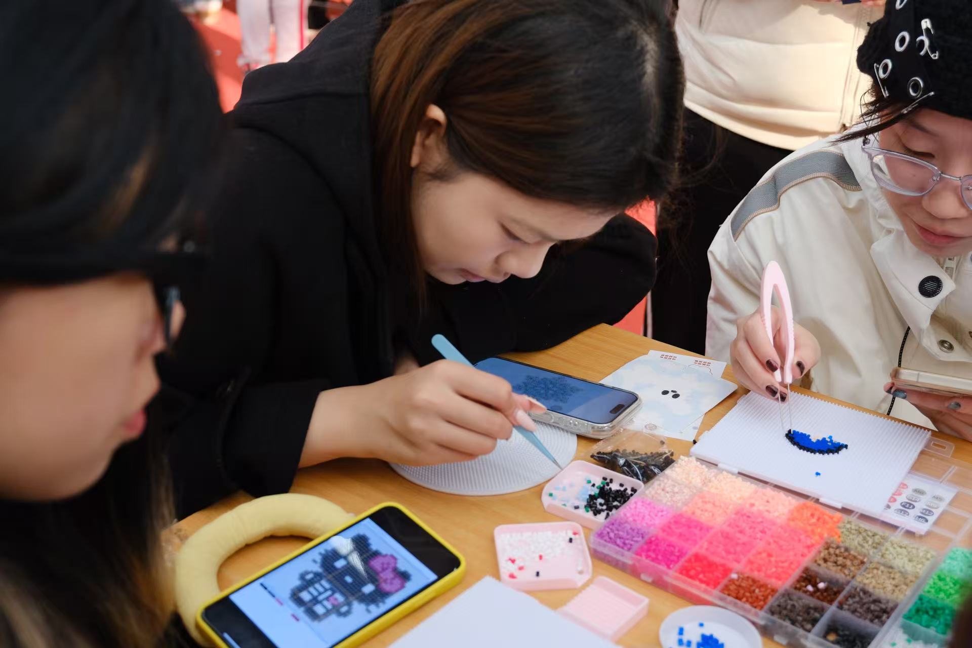 体验过动感的协作挑战,“以美润心,抒定情绪”的手工环节带来了别样的宁静,参与者领取拼豆材料包后,挑选喜欢的图案模板,将彩色拼豆逐颗拼摆、熨烫,让零散豆粒在指尖汇聚成精致造型。专注的手工创作舒缓了心绪,也让起伏的情绪在趣味拼豆体验里慢慢平复。